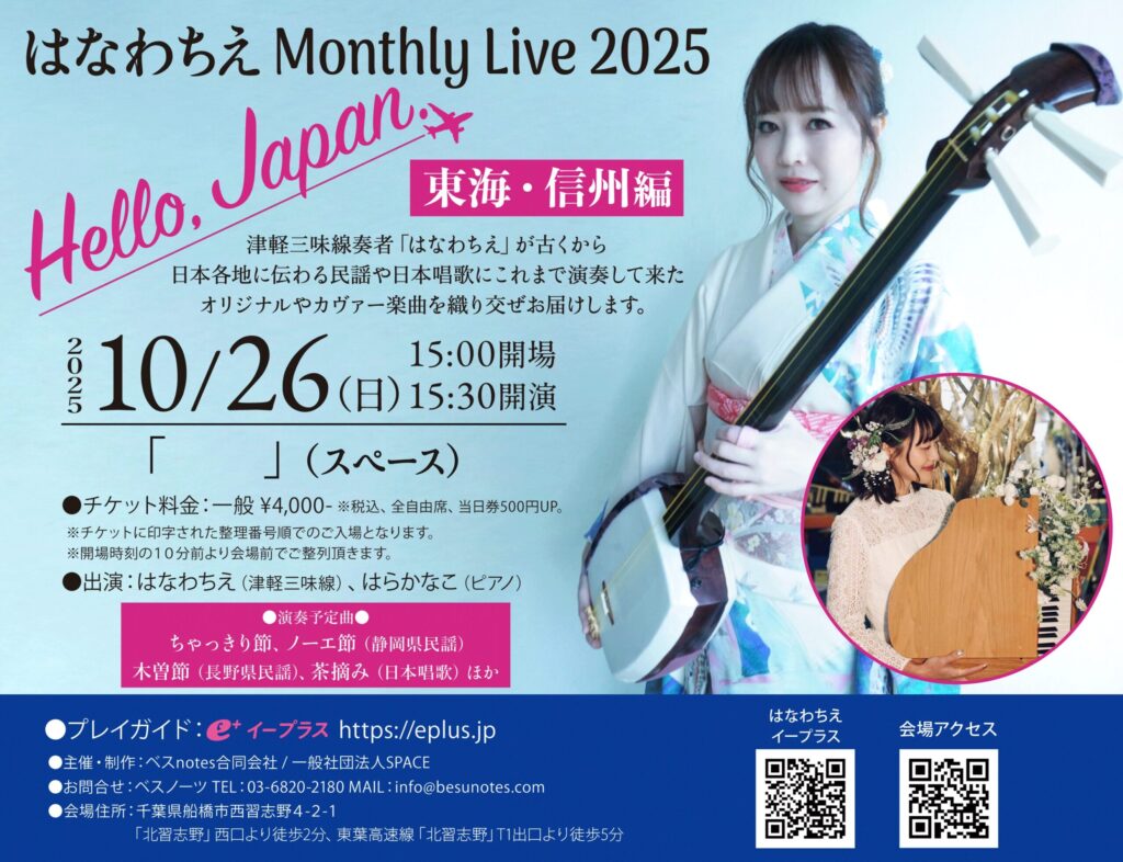 デビュー20周年を迎えた津軽三味線奏者「はなわちえ」が、約8年ぶりにマンスリーライブを開催!古くから日本各地に伝わる民謡や日本唱歌に、これまで演奏して来たオリジナルやカヴァー楽曲を織り交ぜ津軽三味線で奏でます。