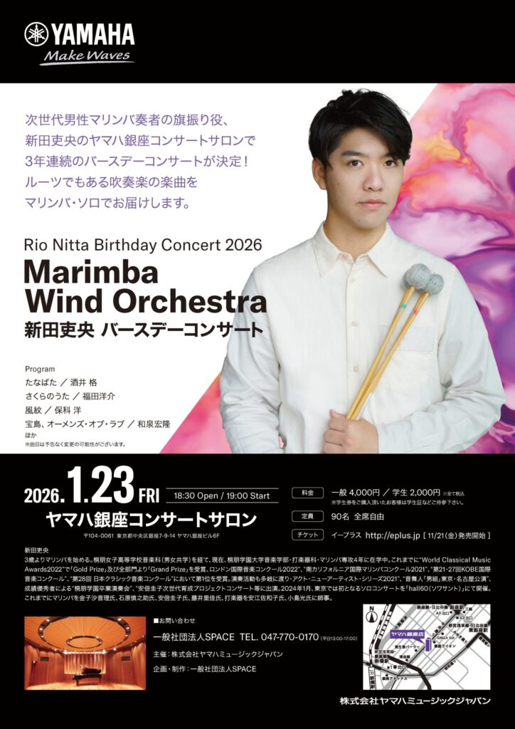 次世代男性マリンバ奏者の旗振り役、新田吏央のヤマハ銀座コンサートサロンで3年連続のバースデーコンサートが決定!ルーツでもある吹奏楽の楽曲をマリンバ・ソロでお届けします。