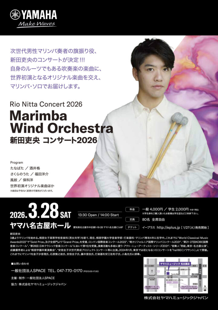 次世代男性マリンバ奏者の旗振り役、新田吏央のコンサートが決定!!!自身のルーツでもある吹奏楽の楽曲に、世界初演となるオリジナル楽曲を交え、マリンバ・ソロでお届けします。